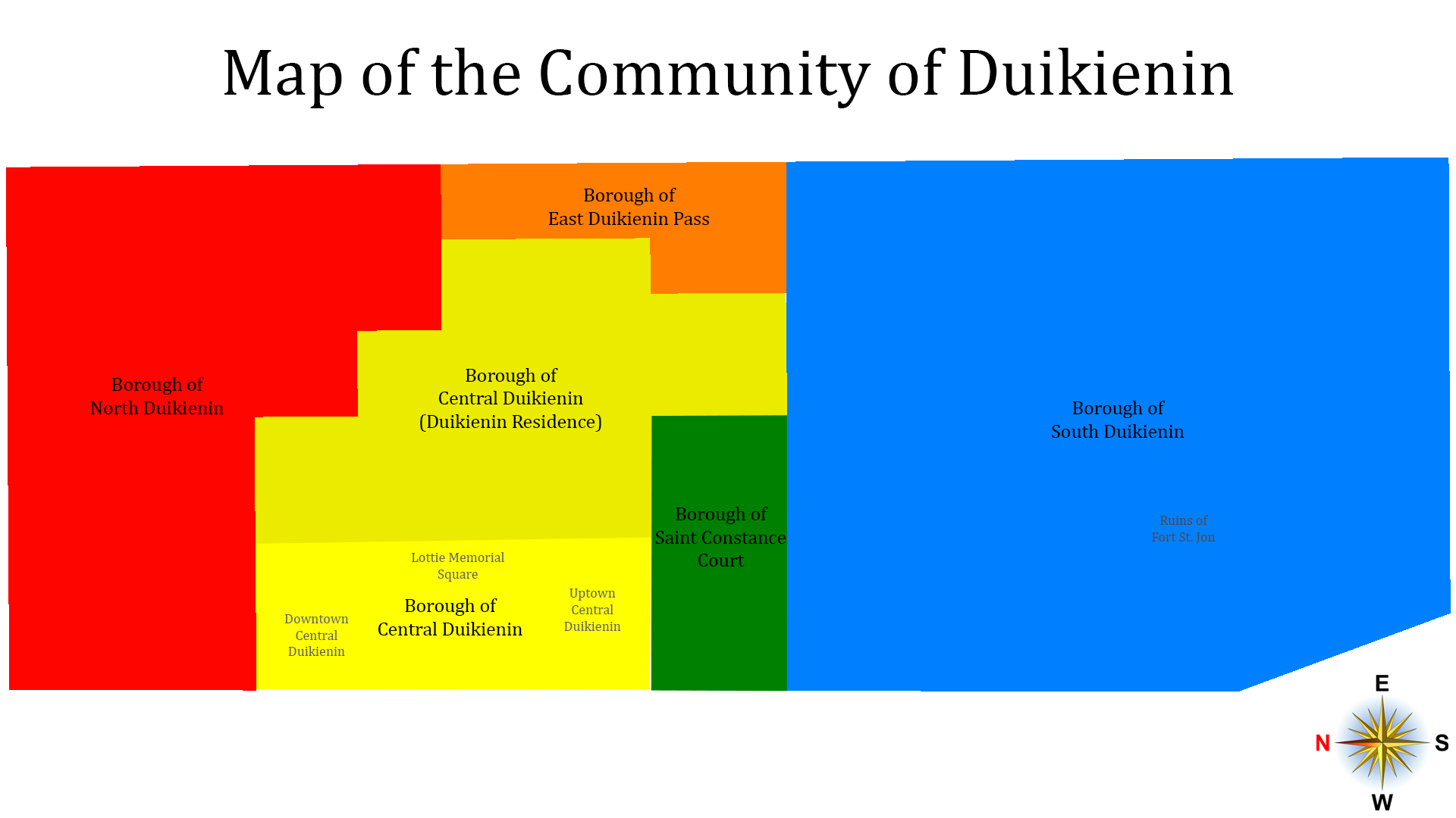 This map shows Central Duikienin, including the five boroughs and major landmarks.